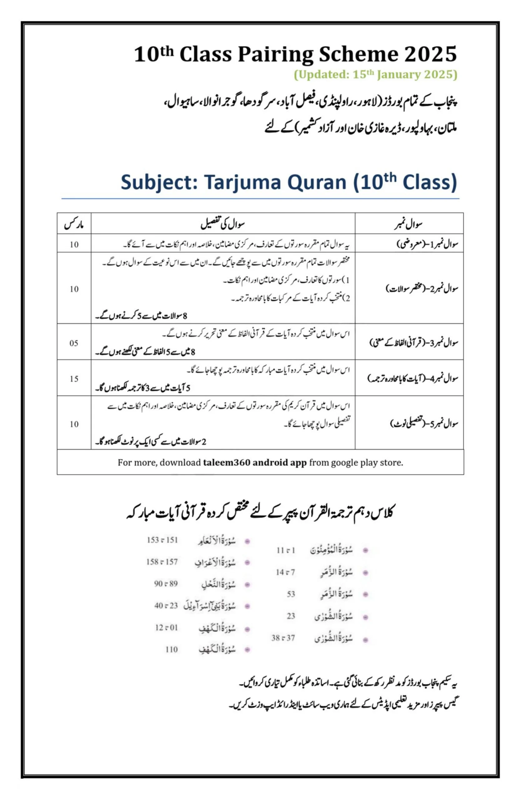 10th Class Tarjuma-tul-Quran Pairing Scheme 2026