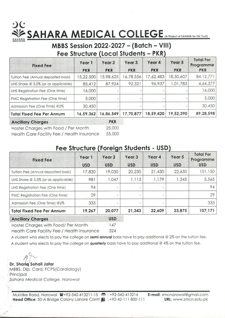 Sahara Medical College Narowal continues to serve as a high-quality medical institution providing affordable MBBS education in Pakistan. With transparent fee structures, modern facilities, experienced faculty, and strong clinical exposure, SMC remains a top choice for students seeking to pursue an MBBS degree for the 2025โ2030 session.